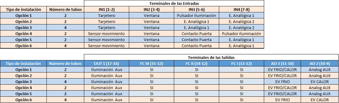 - Dos salidas 0-10V para vávlulas (2 tubos / 4 tubos)