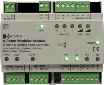 e-Room Modular PRO es un controlador de carril DIN diseñado para fan-coils 3 velocidades con salidas relé y control de válvulas con salida proporcional 0-10V. El equipo incorpora un puerto de comunicación Modbus que permite su integración y control remoto desde un sistema BMS.