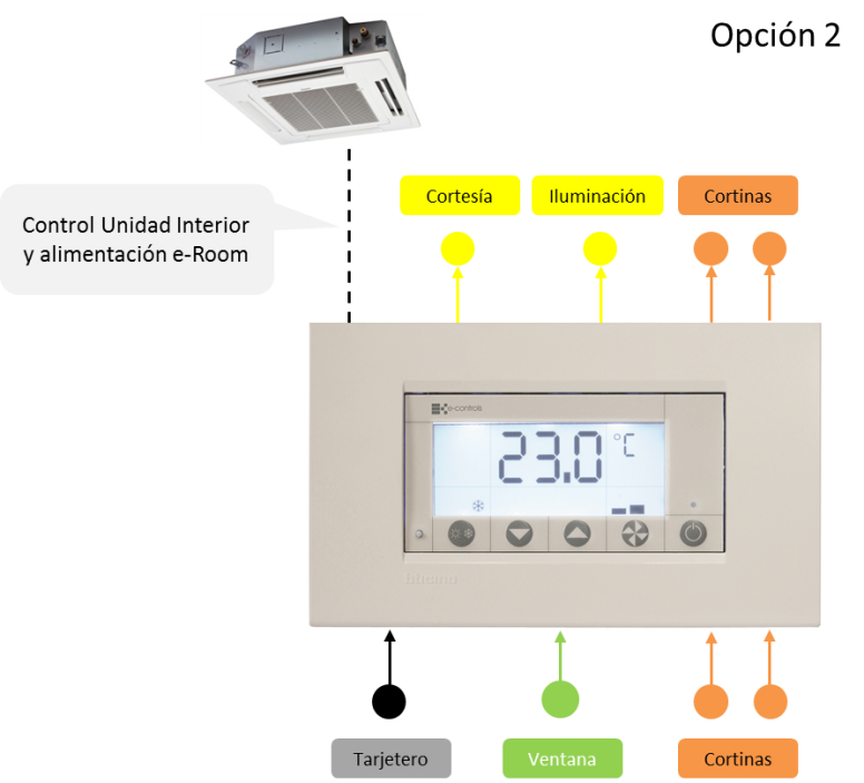El equipo dispone de entradas digitales/analógicas que se utilizan para detectar el estado de ocupación de la habitación a través de un contacto tarjetero o de un detector de movimiento y un contacto puerta, así como el estado de la ventana que se utiliza para parar la climatización cuando esta se encuentra abierta. A través de una entrada analógica a la que se le conecta una sonda de temperatura externa es posible controlar la climatización de una segunda zona en estancias separadas como habitación y baño. El equipo incluye diversas salidas tipo relé para controlar diferentes funciones como el estado de la iluminación, las cortinas o persianas motorizadas y una zona secundaria de climatización.