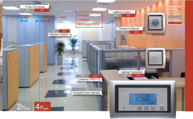 En instalaciones de oficinas el equipo controla el sistema de climatización y la iluminación de la zona o despacho en función del estado de ocupación de la zona. Cuando el detector de presencia detecta el movimiento de personas, habilita el equipo, permitiendo al usuario conectar la climatización y modificar la consigna de temperatura según sus necesidades. Con la zona ocupada el equipo activa la salida de iluminación y controla automáticamente su desconexión pasado un tiempo desde la última detección de movimiento. El usuario puede también utilizar un pulsador de pared para fijar el estado de la iluminación a encendida permanentemente.
